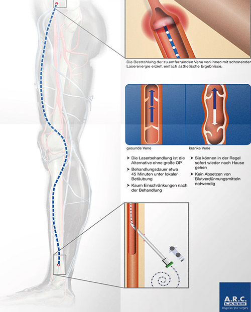 Bei dieser Form der Krampfaderbehandlung wird die Laserenergie dazu genutzt, das betroffene Gefäß lokal zu behandeln. Durch die Anwendung des Lasers wird das umliegende Blut erwärmt, die anliegende Venenwand zieht sich zusammen und verschließt sich. Der Eingriff wird ambulant in örtlicher oder regionaler Betäubung durchgeführt. Zunächst wird eine dünne Sonde unter Ultraschallkontrolle in die betroffene Vene eingeführt. Während der Behandlung wird die Sonde langsam unter Abgabe von Lichtenergie aus dem Gefäß gezogen. Für die erste Zeit nach dem Eingriff wird zur Gewebestützung des behandelten Beines ein Kompressionsverband angelegt.